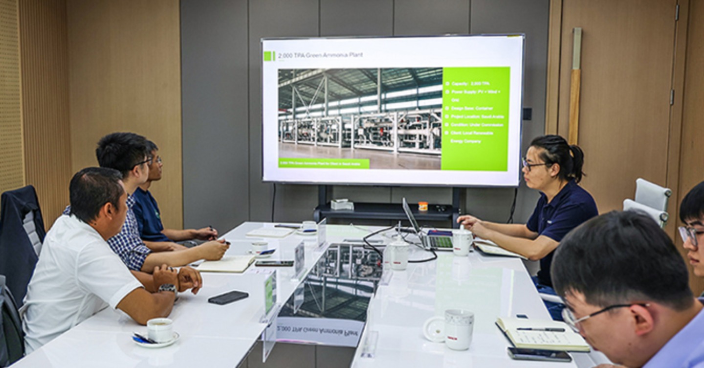 Después del intercambio, la gerencia del proyecto BCE fue a nuestra base de fabricación de equipos para visitar la planta de producción de amoníaco verde recientemente desarrollada por KAPSOM y obtener una comprensión en profundidad del flujo del proceso, los parámetros del equipo y el sistema de control de este equipo.