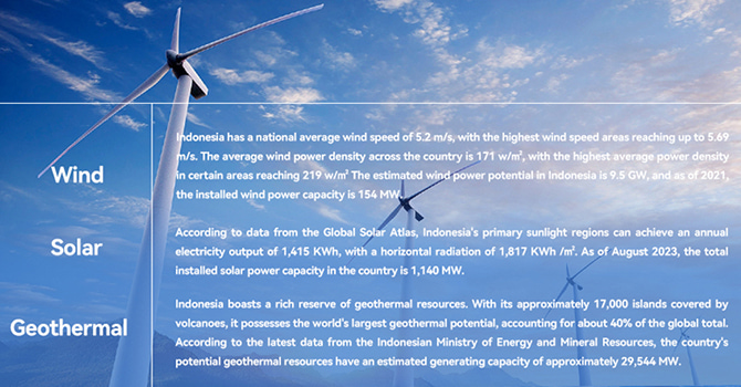 Indonesia, el cuarto país más poblado del mundo, la principal economía del Sudeste Asiático y un importante centro regional de carbón, se ve impulsada por su inmensa población y su rápido crecimiento económico, que han impulsado un aumento continuo de su demanda de electricidad. En la tendencia global hacia la descarbonización, Indonesia también ha comenzado a impulsar la transformación y el desarrollo de sistemas energéticos verdes y sostenibles. Se ha comprometido a alcanzar una participación del 23 % de energías nuevas y renovables en su estructura energética nacional para 2025 y aspira a alcanzar la neutralidad de carbono para 2060.