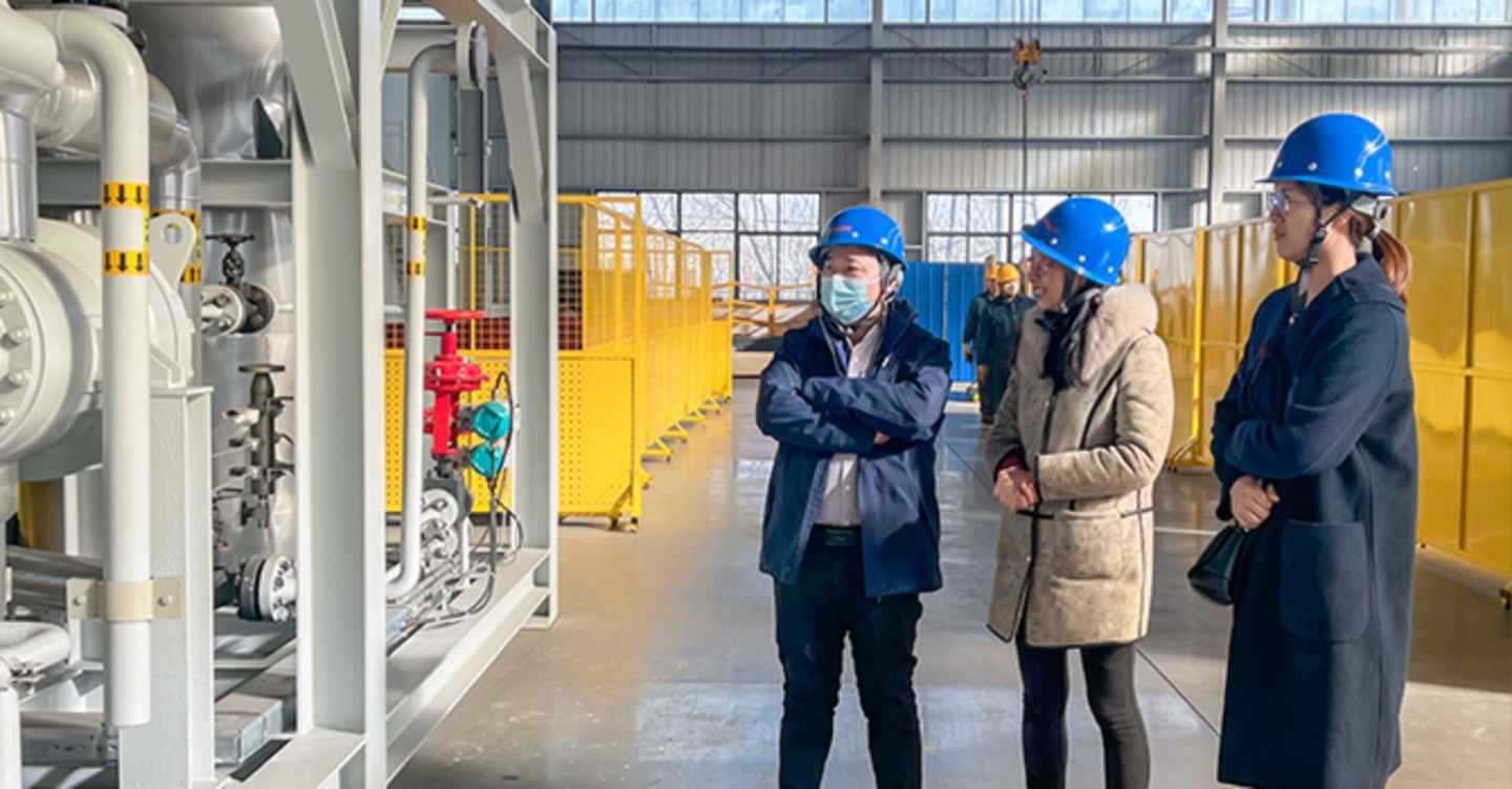Durante la visita a la planta sobre patines, el Sr. Gu ratificó la idea general de la pequeña planta de amoníaco sobre patines desarrollada por KAPSOM y, al mismo tiempo, presentó numerosas sugerencias para la optimización de los equipos. Mediante profundos intercambios, ambas partes han profundizado su conocimiento sobre las aplicaciones multiescenario del suministro de energía distribuida en el ámbito de la industria química ecológica.